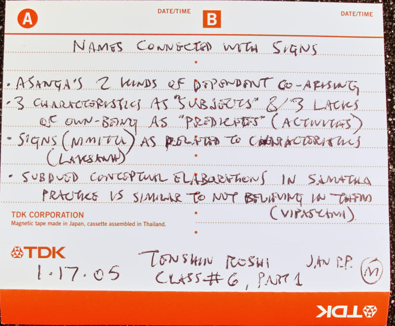 the baby sees that somebody as though they were existing independently. And because they see the person that way, they will be able soon to designate that person as mother or something. The next time they see... Gradually, as they see that person, the sign of that person and the projection of essence on them will allow them to say mother or whatever, or not mother. The emotions that are overlaid come later. This process is the basic process that we're addressing as the source of affliction. Okay. And then the other day you had mentioned something about sitting in the Zen Do and being... I don't want to use the word stupid, but just letting things be there,